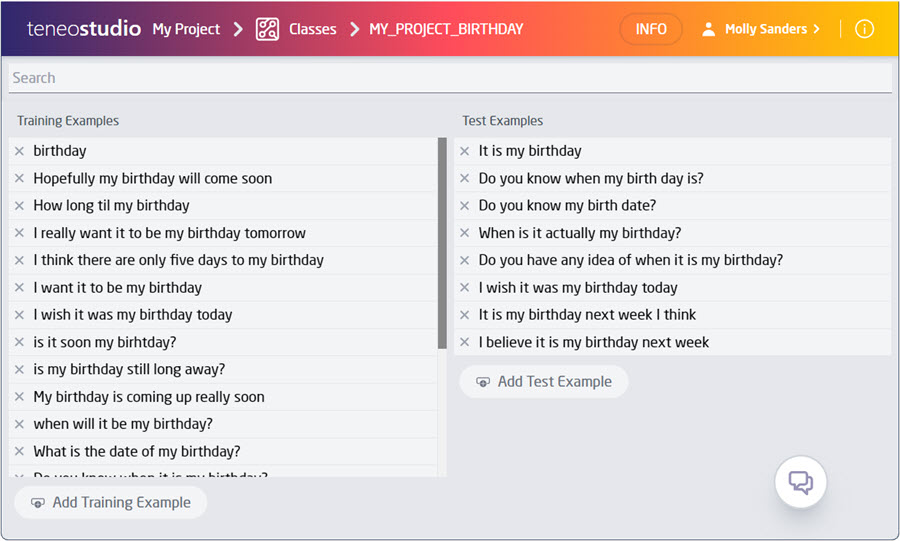 The Class Manager, in Teneo 7.3, brings support to test data examples and introduces linked test examples! The test data examples are added either manually or by import to classes while the linked test examples are the positive User Intent examples of flow triggers which make use of a Class Match.