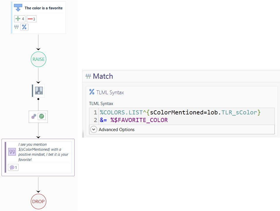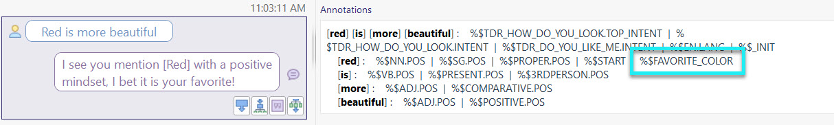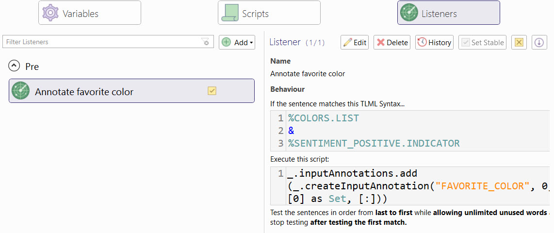 As mentioned above, it is also possible to script annotations from Deferred Annotations and Global Pre(-matching) Listeners. Below is exampled the implementation of the FAVORITE_COLOR annotation which is attached to the mentioned word if it, first, matches the TLML syntax of the Language Object COLORS.LIST, secondly if it appears as the first word in the input and, third, if the Language Object SENTIMENT_POSITIVE.INDICATOR is also matched (indicating that the user talks positively about the mentioned color).
